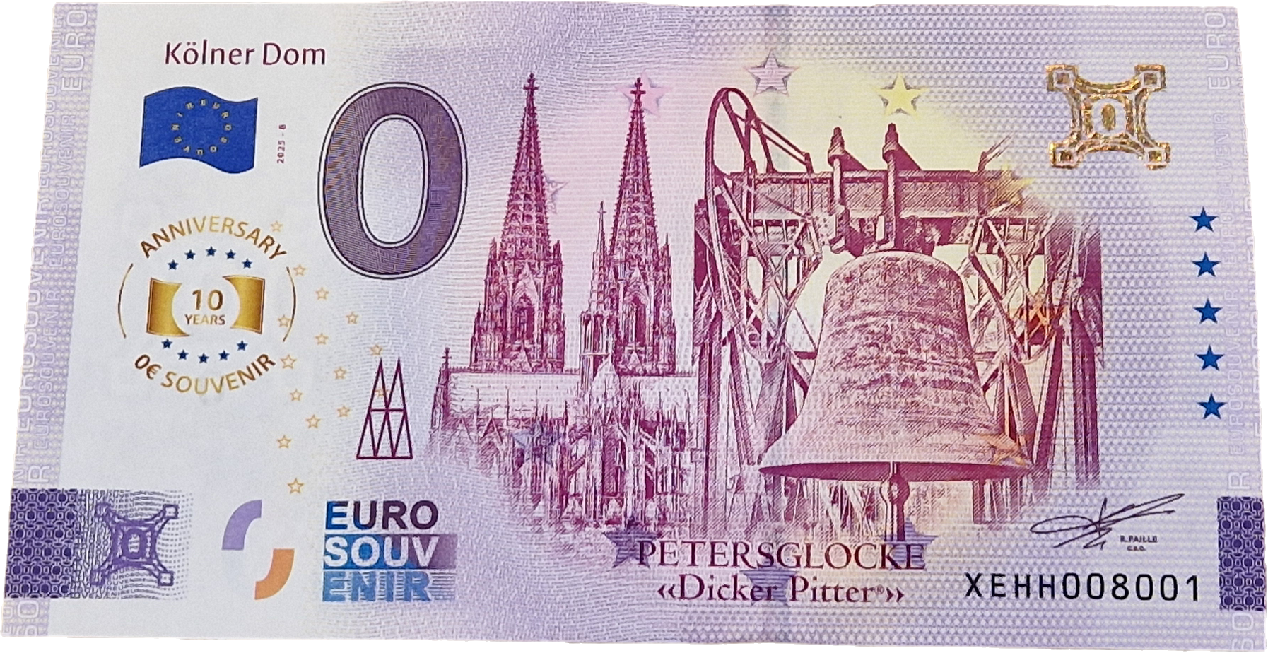 Er fühlt sich an wie ein echter Geldschein – aber er ist ein einzigartiges Souvenir. Der Euroschein Kölner Dom ist mit allen üblichen Sicherheitsmerkmalen eines echten Geldscheins versehen – also beispielsweise Seriennummer, Mikroschrift, Wasserzeichen und Hologramm. Zudem wurde echtes Euro-Papier verwendet. Jedoch zeigt dieses außergewöhnliche Souvenir auf der Vorderseite den Kölner Dom mit der Petersglocke und auf der Rückseite verschiedene europäische Sehenswürdigkeiten – vom Eiffelturm bis zum Colosseum.