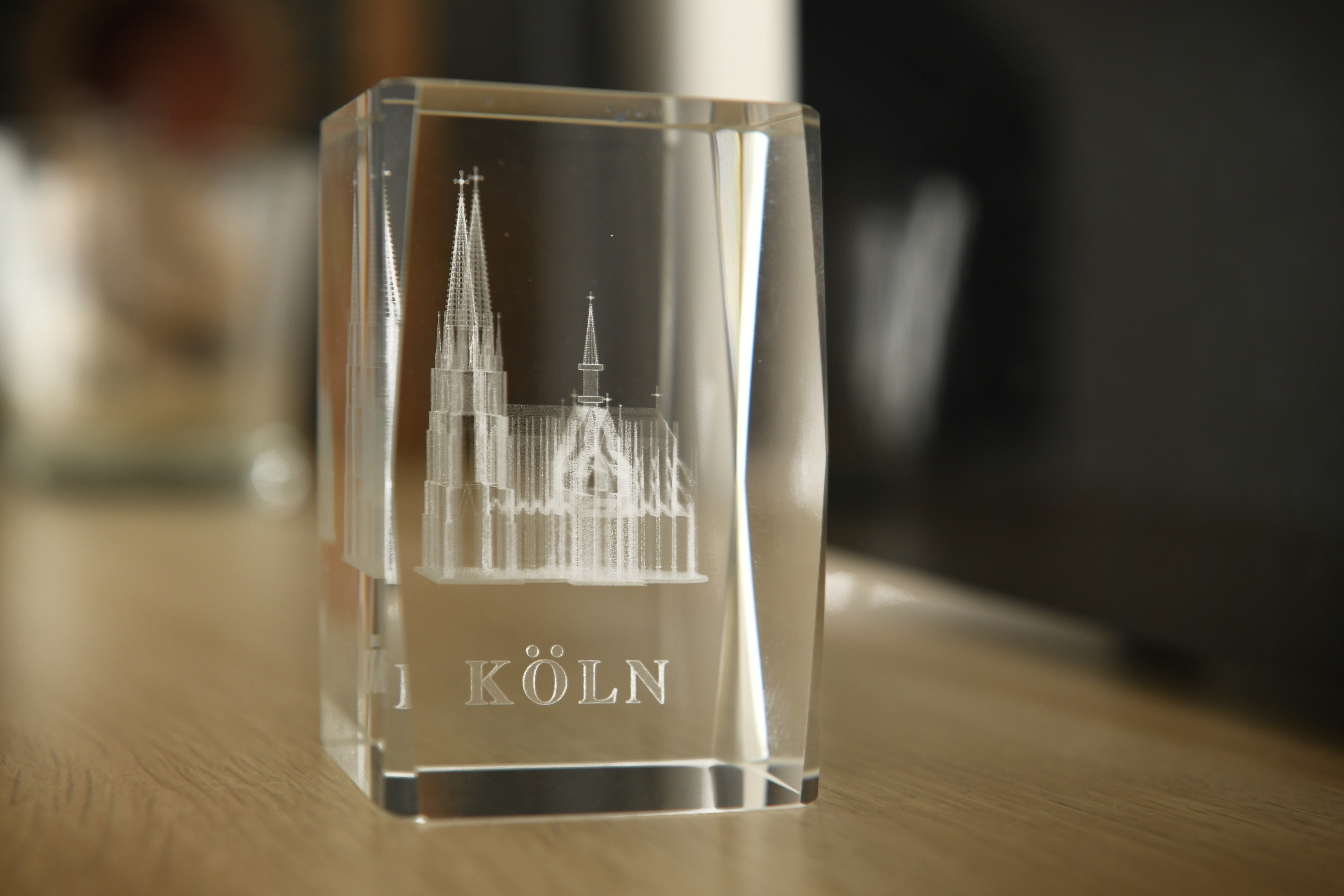 Der Kölner Dom als gelasertes 3D Modell in einem Glasblock. Inklusive gelasertem Schriftzug "Köln"