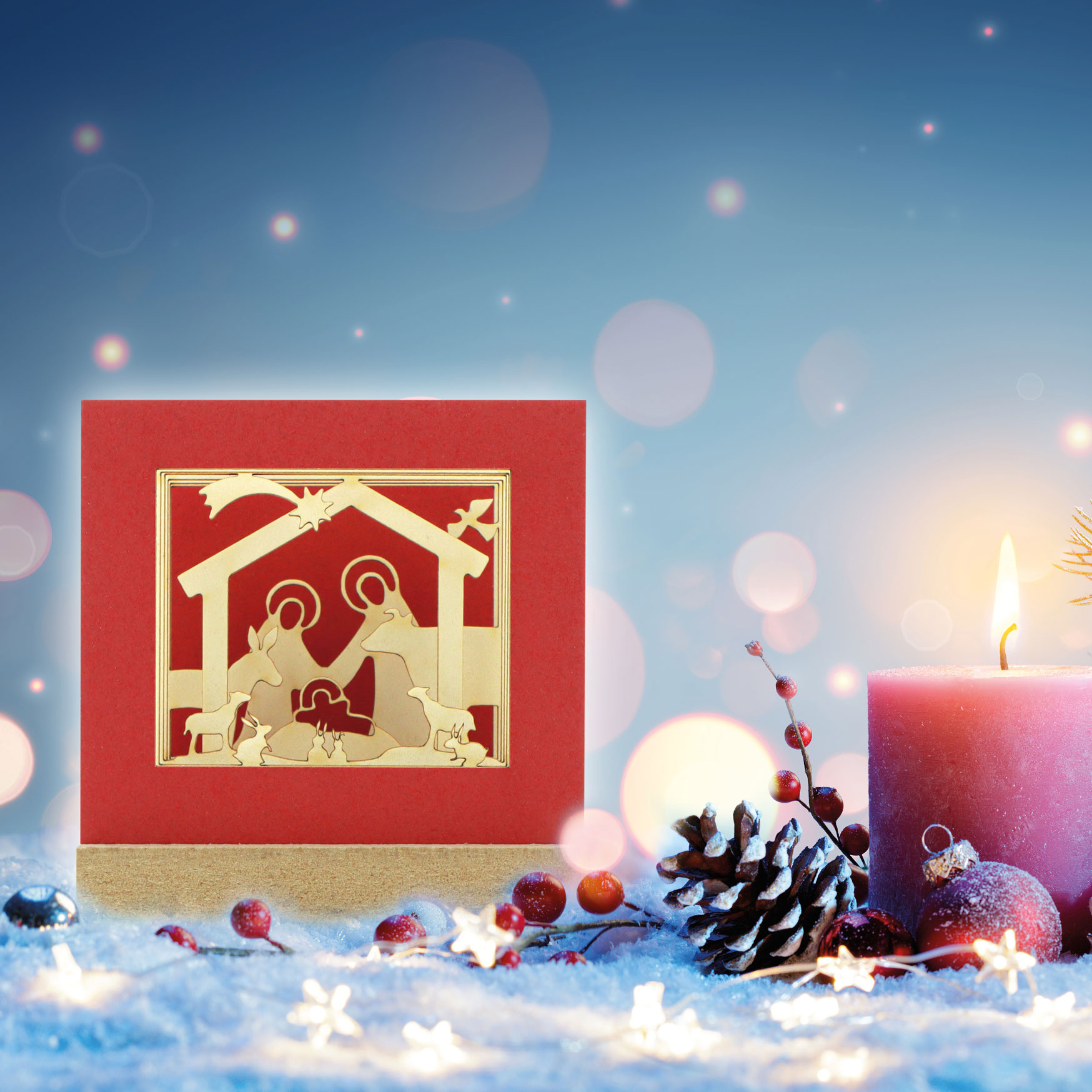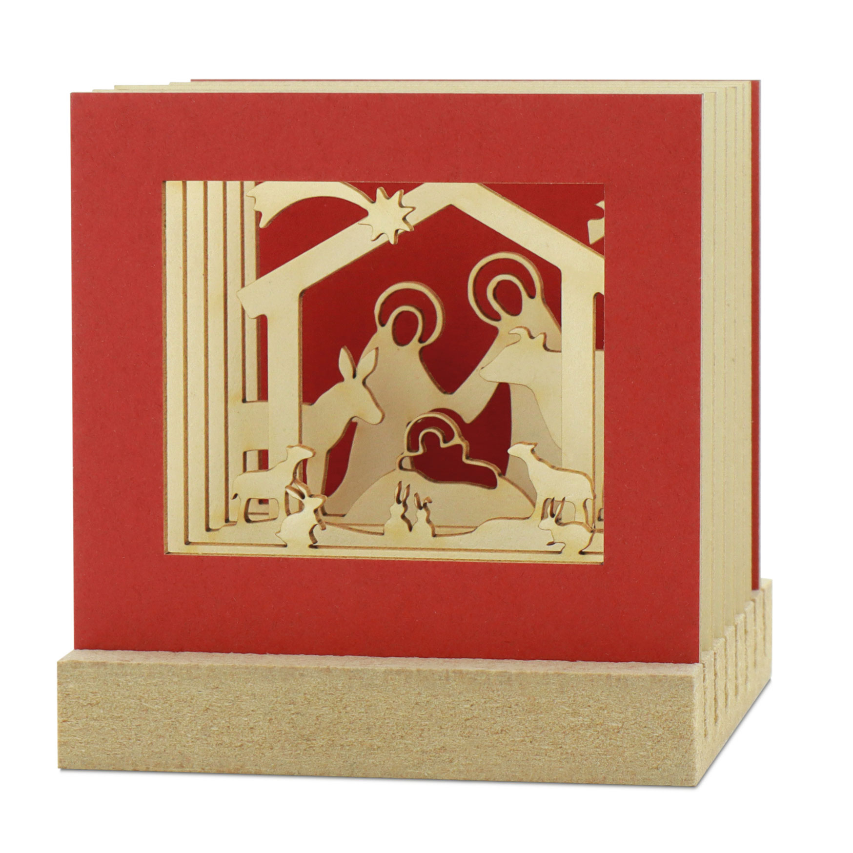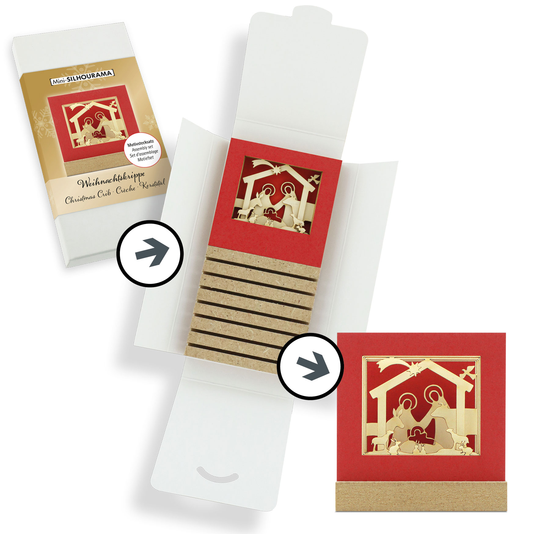 Dieser Krippen-Motivstecksatz ist eine kleine Spielerei für Groß und Klein. Die einzelnen Akteure, etwa Maria und Joseph oder die Stalltiere mit dem Jesuskind in der Krippe, bilden die einzelnen, nummerierten Silhouetten. Die quadratischen Holzplättchen werden der Reihe nach in die Schlitze des vorgefertigten Bodenholzes gesteckt. Als Ergebnis erhält man eine filigran gearbeitete Krippe in dreidimensionaler Optik.