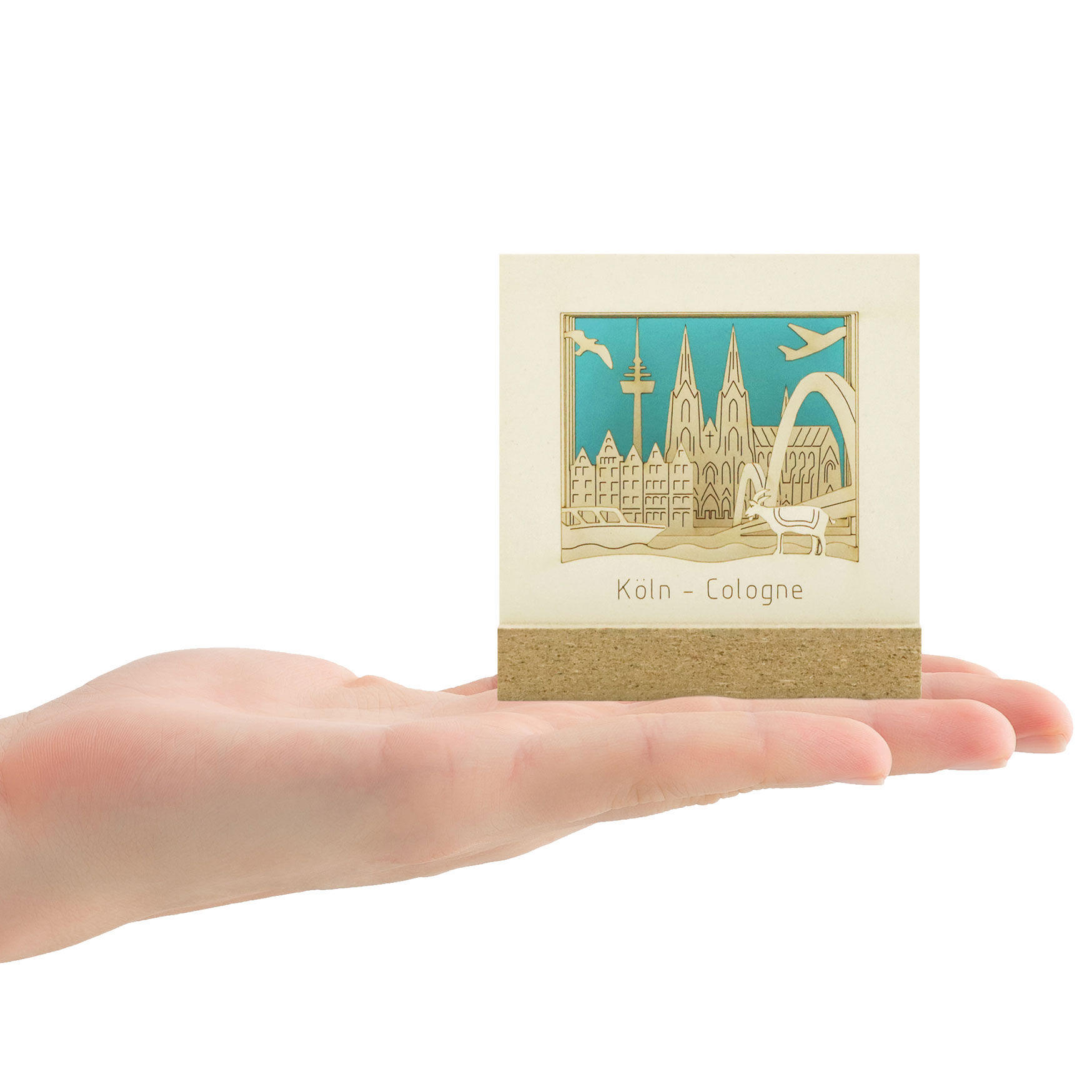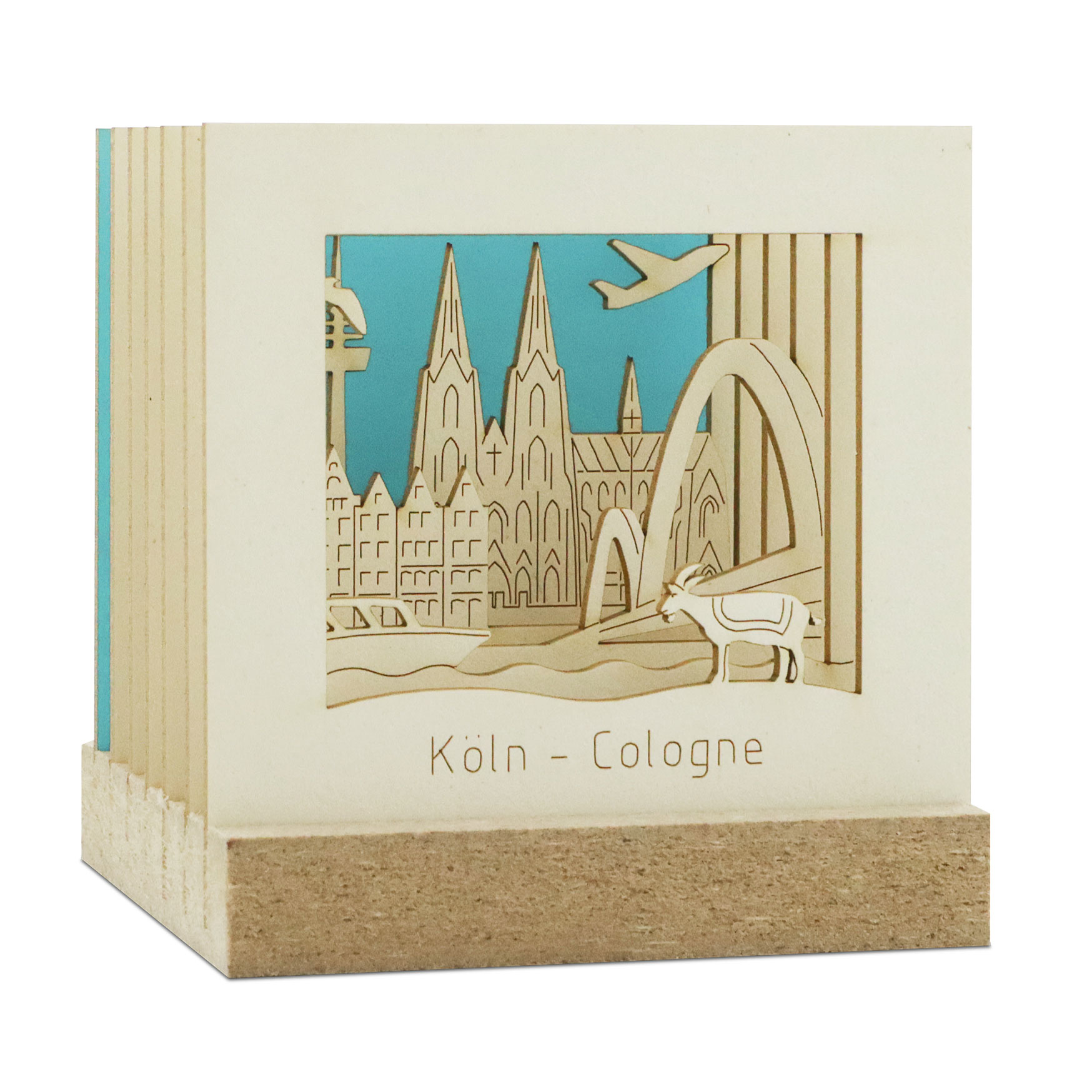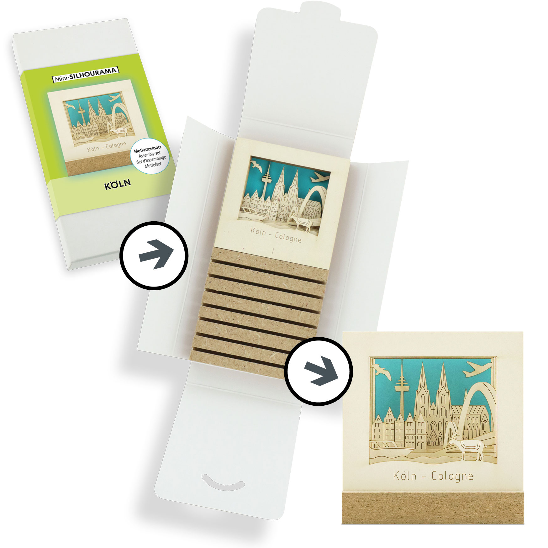 Der kleine Motivstecksatz zeigt die Stadtansicht von Köln mit bekannten Sehenswürdigkeiten, wie dem Kölner Dom, den Häusern der Altstadt und der Hohenzollernbrücke.