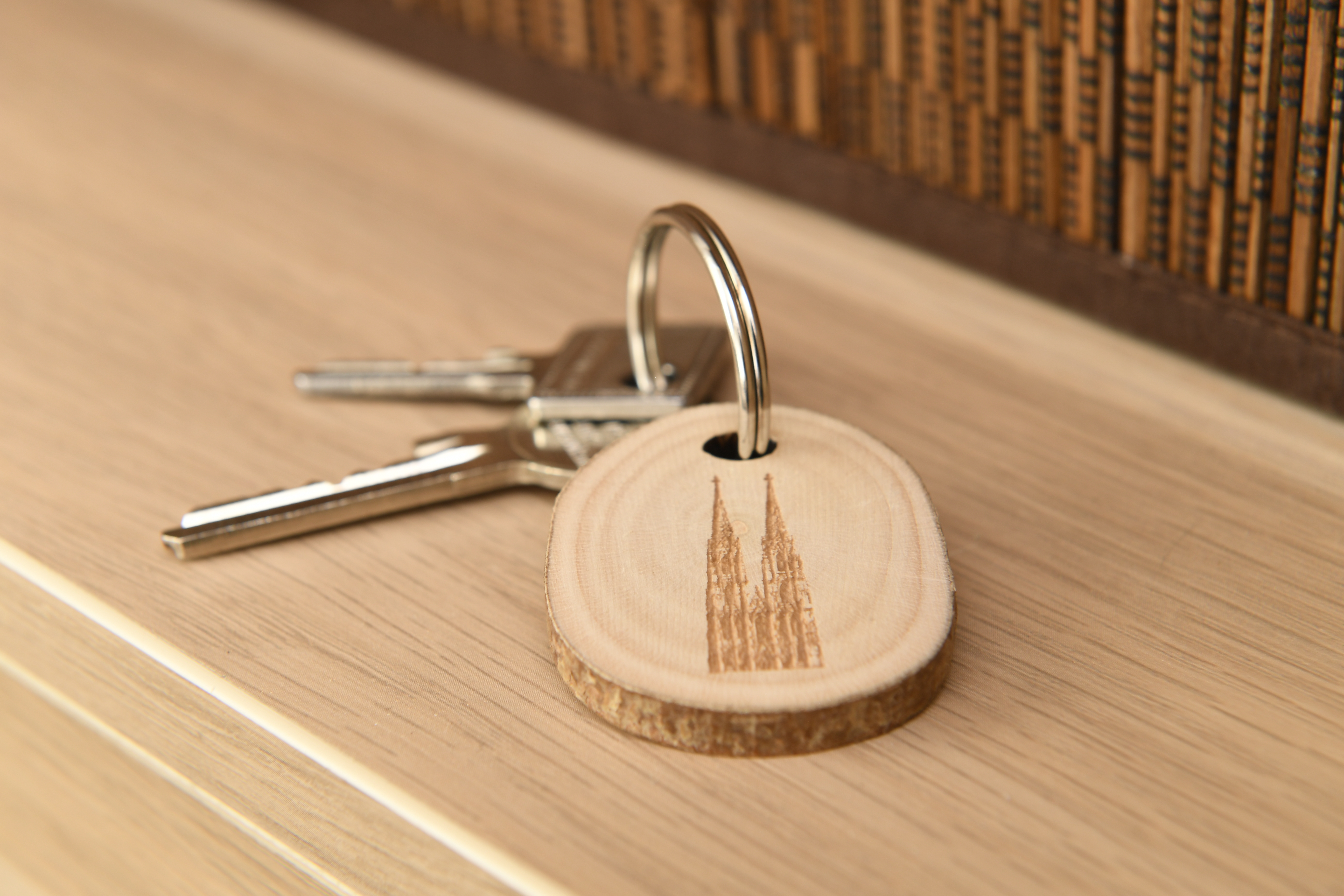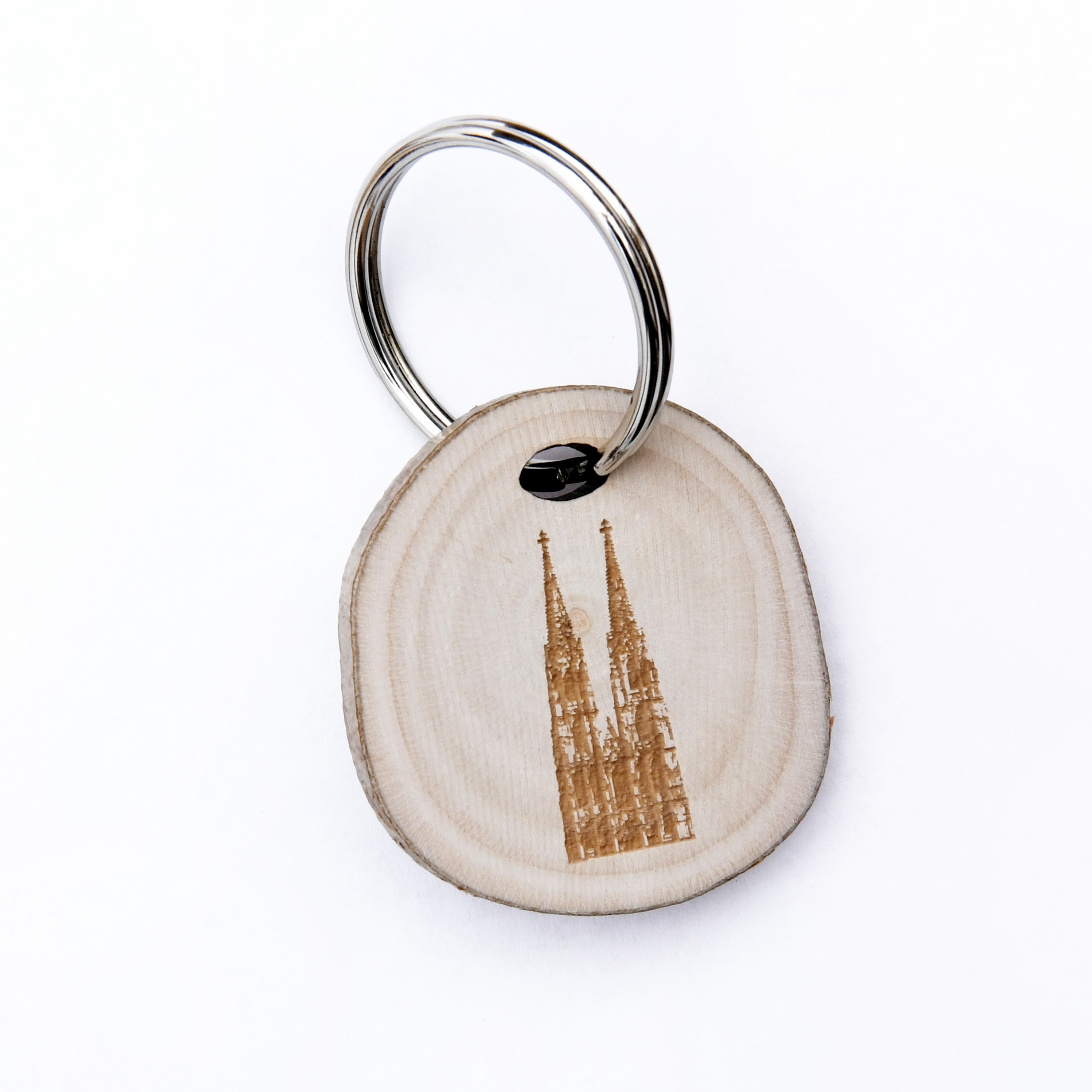 Ein Schlüsselanhänger aus unbehandelten Haselnussholzscheiben mit Metallring. Auf der Vorderseite mit den gravierten Motiven des Kölner Domes wahlweise in der Südansicht, der Westansicht mit Seitenschiff oder der Westfassade nach einer Zeichnung von Arnold Wolff. Die Rückseite zeigt bei allen Motiven das Logo des Kölner Domes mit Schriftzug.